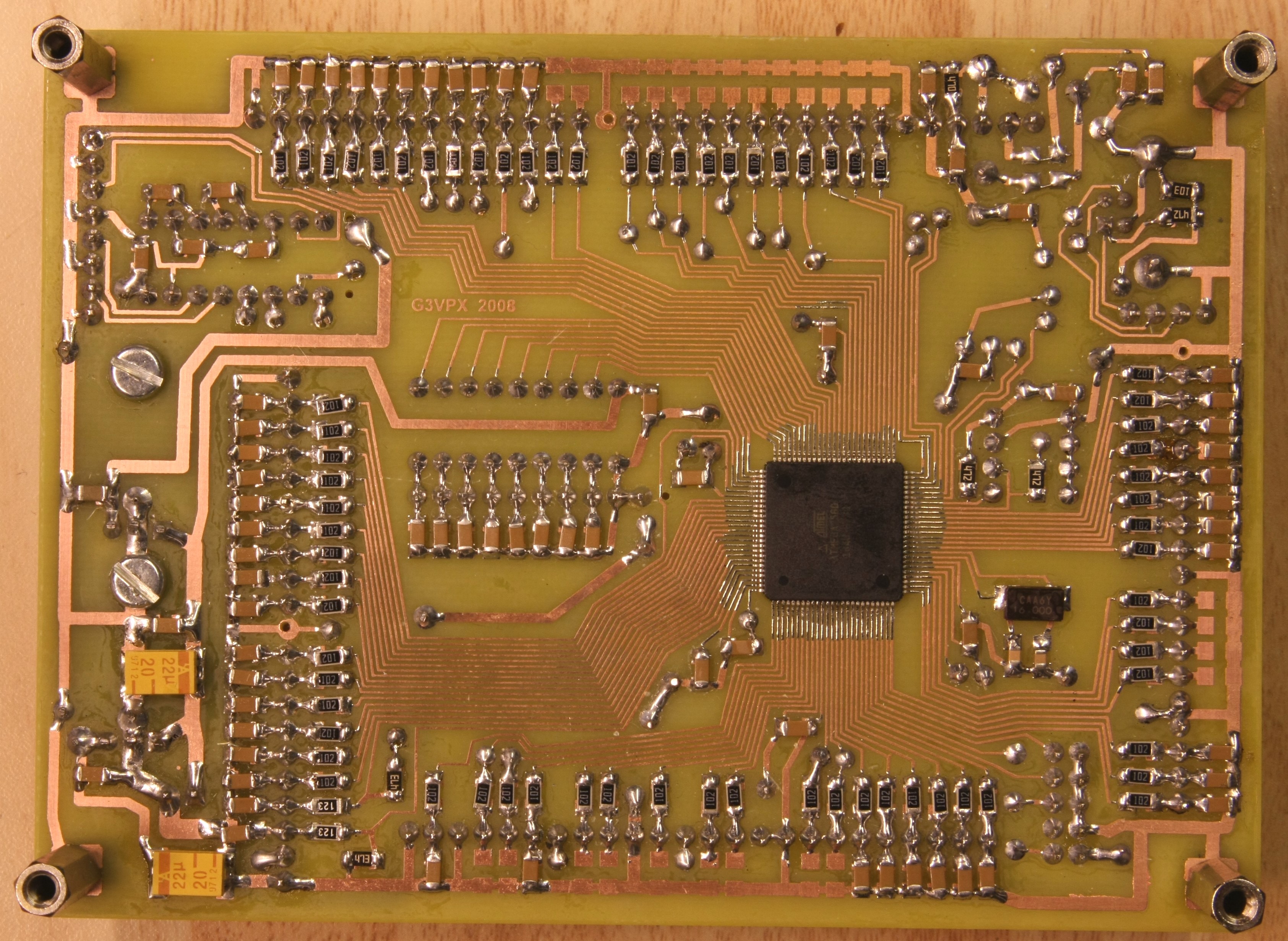 TrxAVR-A bottom side (top in Pad2Pad layout design files). ATmega2560 chip and adjacent SMD crystal.