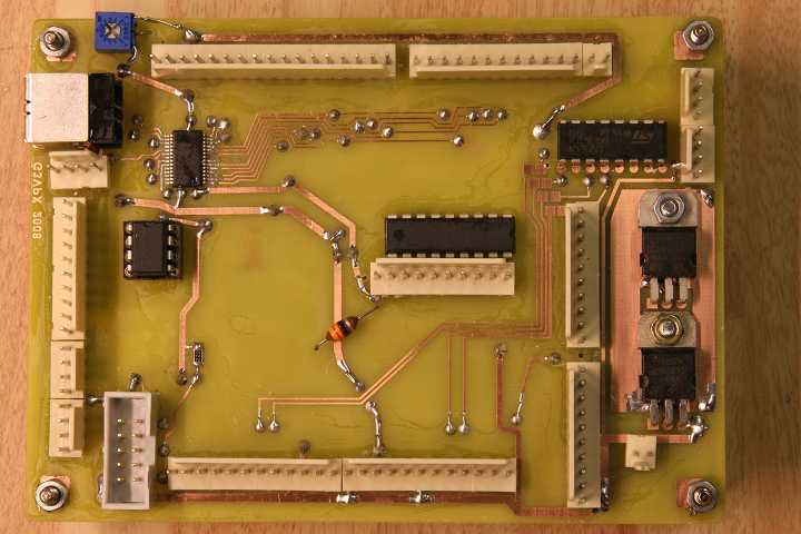 I/O connections from the processor in the centre of the board radiate out to 0.1 inch connectors with very few crossovers.